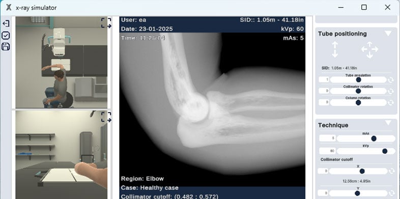A virtual lab complements real energized labs, giving students unlimited X-ray exposure and positioning practice without the radiation risk.